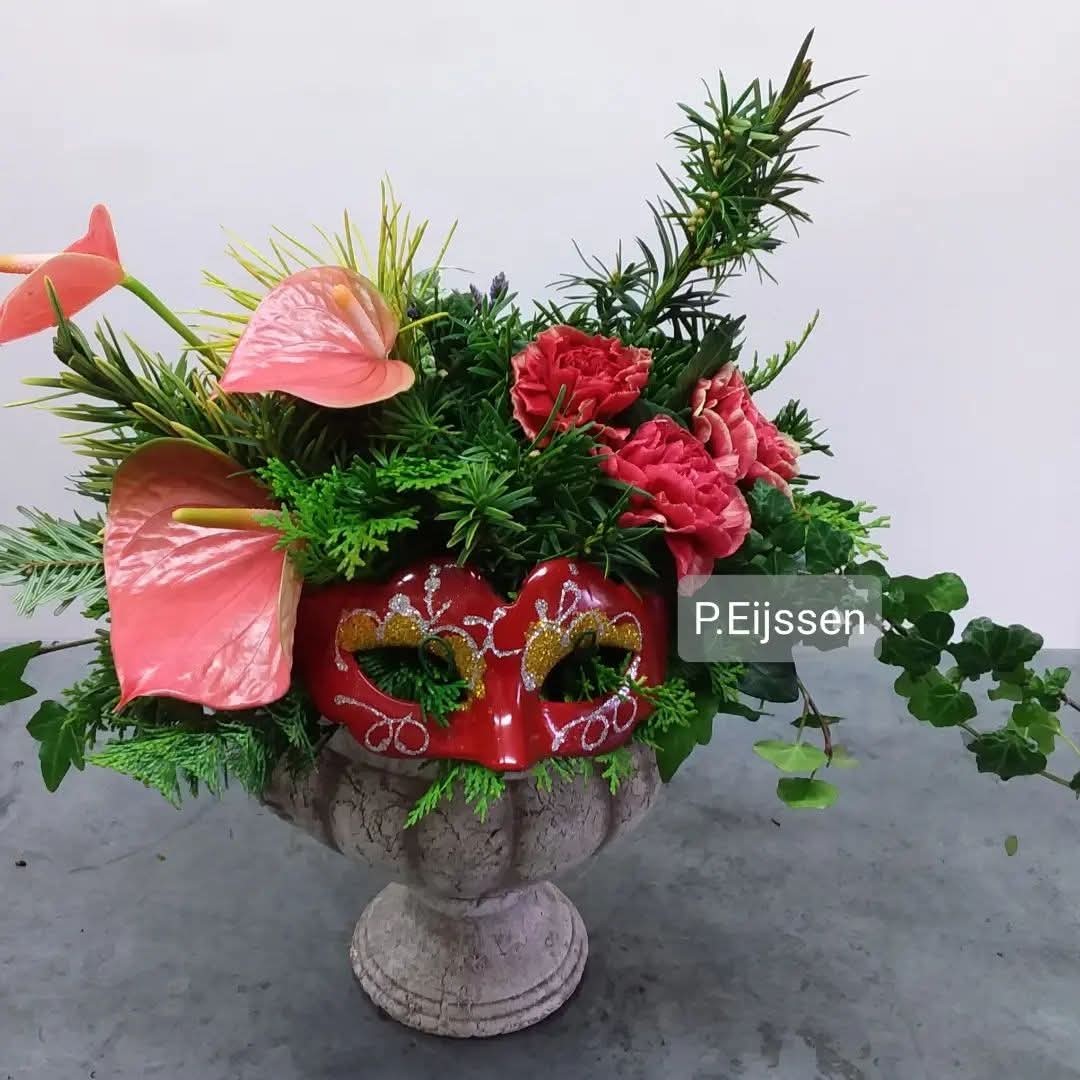 Atelier van Petra, GeleenTijdens deze les maakt u een bloemstuk (foto: bloemstuk carnaval) met een masker en bloemen in de kleuren rood-geel-groen. Veren en vrolijke decoraties om het geheel naar eigen smaak en inzicht nog feestelijker te maken zijn aanwezig.